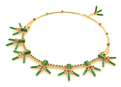 Mô tả nét nổi bật về nguyên liệu siêu cấp của vàng 18K, san hô, ngọc bích, thiết kế tế nhị này gồm một dây chuyền, hai kiểu bông tai, chiếc nhẫn nam và nữ, một ghim cài cà-vạt, và kẹp cà-vạt. |
