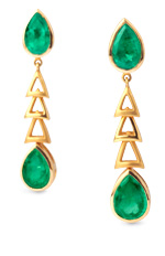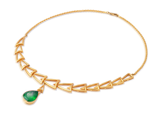 Dây chuyền, vòng đeo tay và nhẫn làm bằng vàng 22k cẩn lục bảo ngọc. Kiểu đơn sơ nhưng thanh nhã và những đường bóng láng phản ảnh nét cắt rõ ràng, tính chất thẳng thắn của con người đương thời.