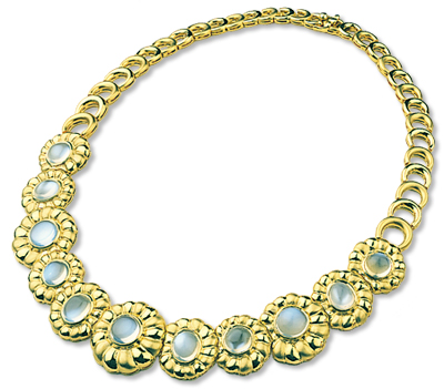 Dây chuyền, bông tai, vòng đeo tay, và nhẫn làm bằng vàng 22k và được trang trí với cẩn đá, một loại đá phổ thông đặc biệt trong những người tu hành Ấn Ðộ, họ tin tưởng rằng đá này phát ra một chấn động giúp ổn định những cảm xúc và hệ thần kinh, do đó rất hữu ích cho những người tu hành. Nét tinh xảo tuyệt luân và ánh sáng lấp lánh quyến rũ dường như khai mở niềm chân phúc của sự êm đềm tĩnh lặng bên trong chúng ta.