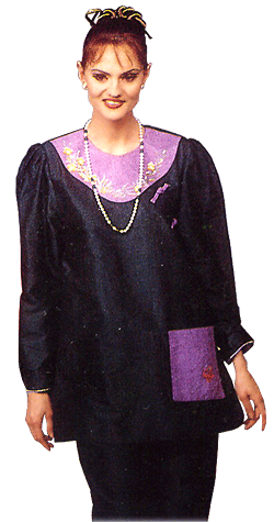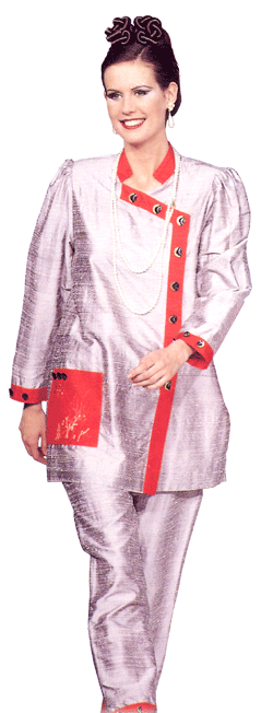 這件中國風味的服飾主要特色在於美麗的對比色調,滿清色系的補綴口袋以及外套前方與褲口的裝飾是絕佳的重點,質料是印度絲,有黃金、銀灰及粉紅色三式。