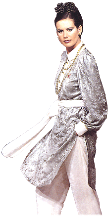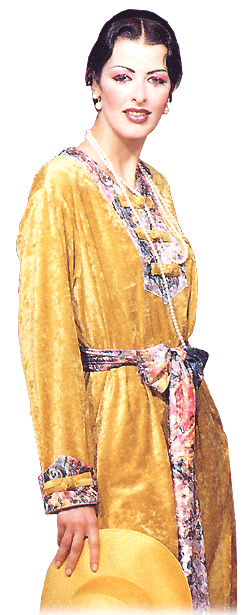 This collection of casual wear is for going out to tea or shopping. The styles are relaxed and comfortable, with a touch of elegance. Suits with pants or skirts designed in agate velvet with delicate and harmonious color combinations, give a romantic and graceful look. A woman wearing the S.M. Celestial Clothes will surely win all the admiring attention whereever she appears!