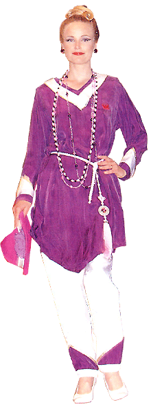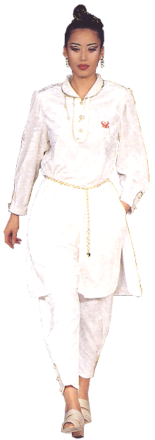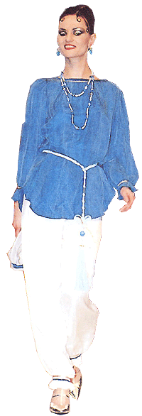 The colors used are elegant blue and pure, graceful white. The unique shaped cuffs and the tailored pant legs display the shy and lovely demeanor of women. A sand-washed silk loose-fitting top and heavy-weight satin pants enable the wearer to be relaxed and active in her activities. If matched with a belt or accessories, this outfit takes on an air of leisure wear but with a touch of elegance.