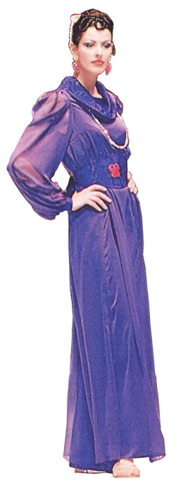 高貴柔和的及地無袖長衫,外罩薄紗,寬邊軟腰帶襯托腰部曲線更動人,適合往上梳的髮型。黑、寶藍、暗紅、藍紫。
