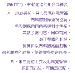 A. A pure silk long-sleeved skirt and a silk vest are matched with a pair of loose-fitting trousers. The fabrics and colors are well coordinated. The trousers are made with the glossy side of the fabric facing outward, maintaining the harmony of the whole design. The gathers on the shirt give a slender appearance to the waistline.
