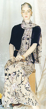 a pleated silk skirt with lavender patterns.