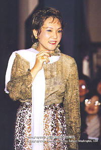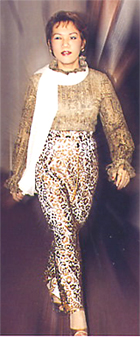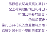 The long metallic gold lace skirt, highlighted by a white silk lining, has a classical decorative pattern that is immensely elegant.