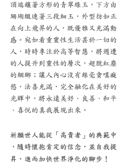 ◆「成為高貴的眾生是我們唯一的選擇,無論多麼艱難,也要勇往直前,無論目的多高、多麼遙遠,也要奮力向上。我們必須一次又一次地努力嘗試,直到在我們內邊只存在好的品質為止,直到我們的內邊只認識上帝的天國,別的什麼都沒有為止。」(原文為英文)