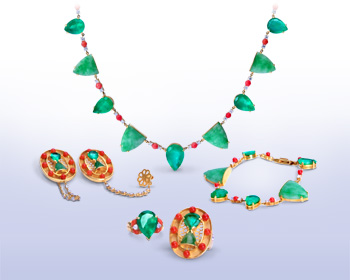 rich combination of coral, jade, diamonds, emeralds and gold represents