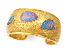 Crescent shaped, an array of rainbow colors sparkle from the blue opals. The design is simple with the most unique feature being the irregularly shaped finest-quality gemstones. Different hues aglow when observed from different angles, the rich opalescence exudes an esoteric touch of ancient Egypt. Reminding us that although the vastness of space and time may have separated us, the power of love hidden deep within is always there, never severed.